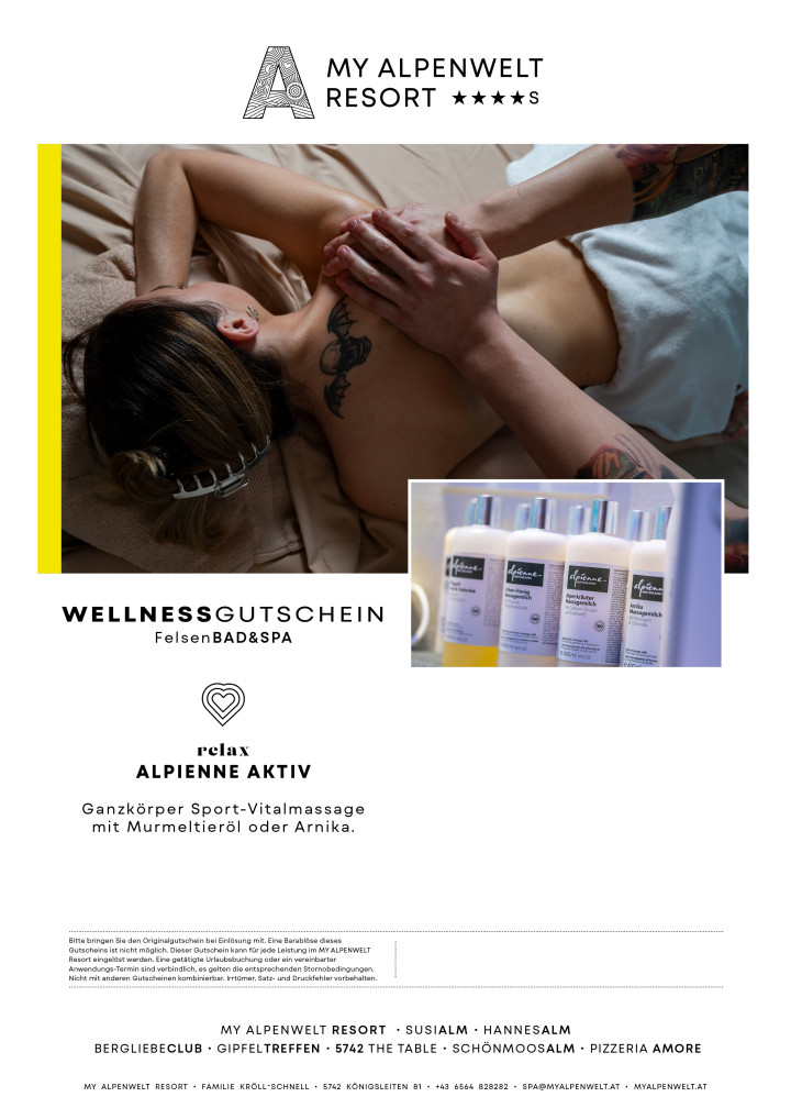 Genieße eine gezielte Behandlung mit hochwertigen Alpienne Naturprodukten. Gönnt euch eine Auszeit für Körper und Geist und erlebt die perfekte Ergänzung zu eurem Aktivurlaub!