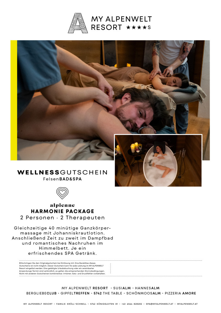 Zeit zu zweit für die schönen Momente des Lebens<br>Ein besonderes Geschenk für besondere Menschen, von Herzen.<br>Ich wünsche euch eine schöne, genussvolle Zeit & einzigartige Bergliebe Moments im MY ALPENWELT Resort Königsleiten.