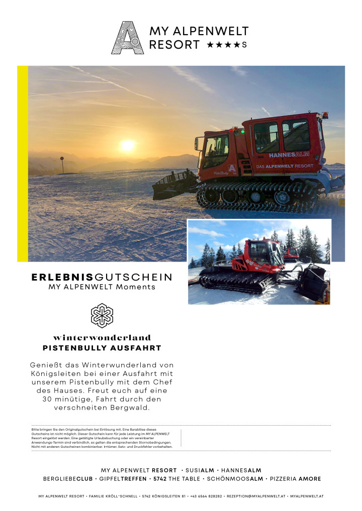 Ein Highlight der ganz besonderen Art: Genießt das Winterwunderland von Königsleiten bei einer Ausfahrt mit unserem Pistenbully mit dem Chef des Hauses. Freut euch auf eine 30 minütige, atemberaubende Fahrt durch den verschneiten Bergwald.