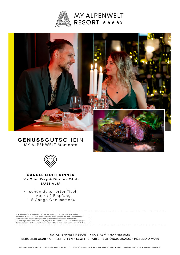 ROMANTIK PUR Lasst euch von uns mit einem herzlichen Aperitif-Empfang willkommen heißen. Gemeinsam werdet ihr an einem schön dekorierten Tisch Platz nehmen, der die perfekte Atmosphäre für euer romantisches Candle Light Dinner schafft und genießt ein 5-Gänge Gourmet Menü der besonderen Art. KLEINGEDRUCKTES • Preis gilt für 2 Personen • Preisänderungen vorbehalten