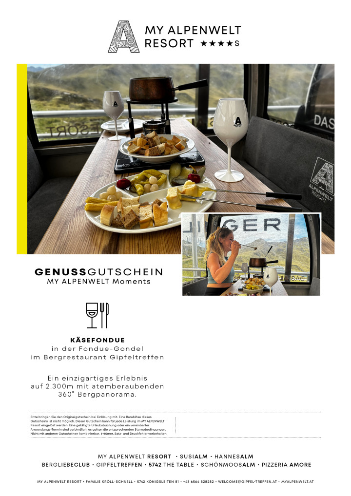 ALL WE NEED IS CHEESE Käsefondue für 2 Personen Erlebt ein ultimatives Geschmackserlebnis von geschmolzenem Käse, begleitet von reichlich schwarz- & Weißbrot, Pfannenkartoffeln und Sauergemüse in unserer Fondue Gondel im Bergrestaurant Gipfeltreffen direkt an der Dorfbahn Königsleiten. KLEINGEDRUCKTES • Einzulösen während der Betriebszeiten der Dorfbahn • Preis für 2 Personen • Exkl. Berg- & Talfahrt • Exkl. Getränke • Preisänderungen vorbehalten